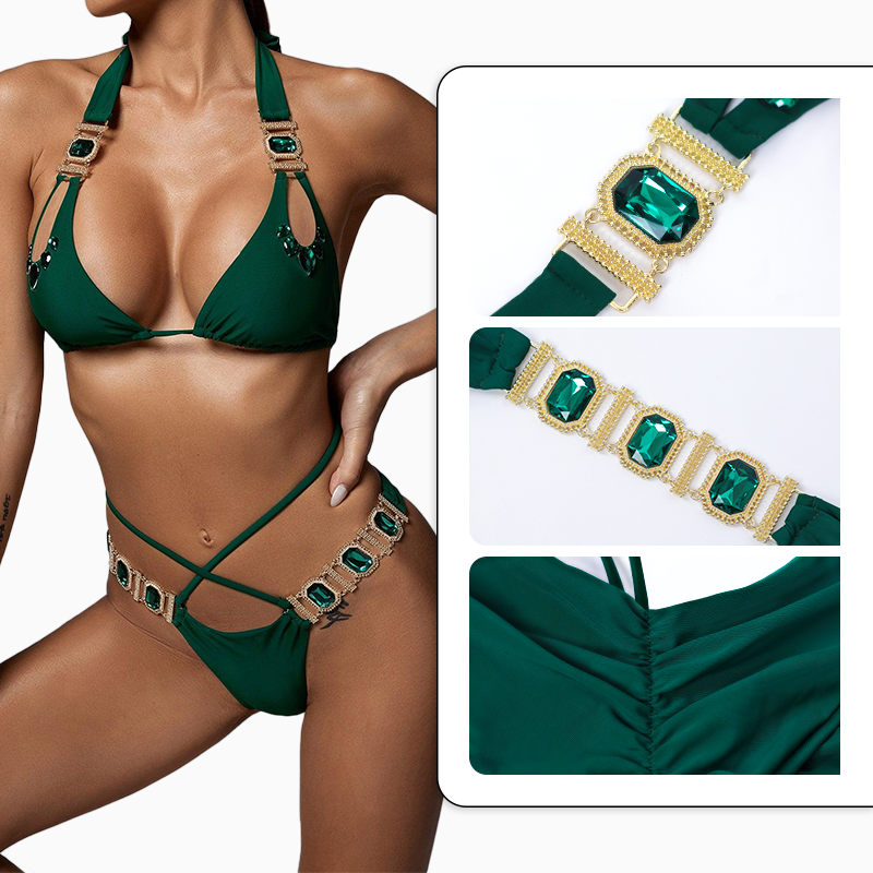 Încântă privirile cu costumul din două piese Crystal Diamond, o alegere perfectă pentru femeile care doresc să strălucească pe plajă sau la piscină. Culoarea verde smarald a acestui costum aduce un strop de eleganță și rafinament, iar detaliile sale atent lucrate transformă fiecare moment într-o experiență de neuitat.